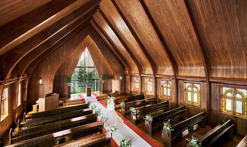 豊かな木の香りと柔らかな自然光に満ちる礼拝堂での挙式は、いつまでもおふたりの記憶に残ることでしょう。