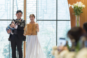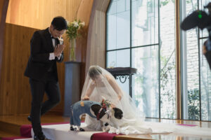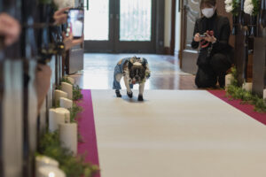 ワンちゃんがバージンロードを歩いて、新郎新婦様へ結婚指輪を届ける演出も可能です。